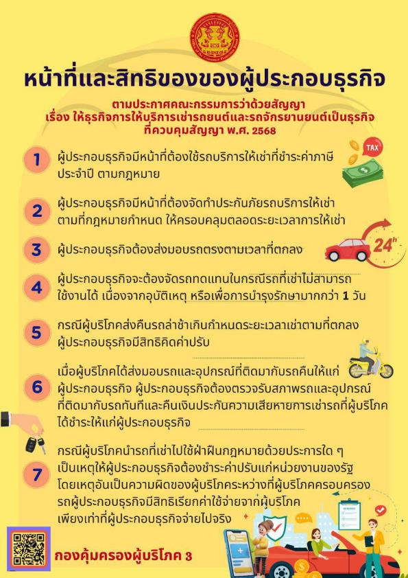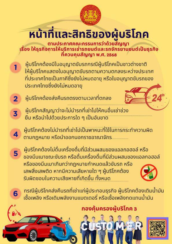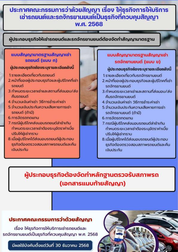 ประกาศคณะกรรมการว่าด้วยสัญญา เรื่อง ให้ธุรกิจการให้บริการเช่ารถยนต์และจักรยานยนต์เป็นธุรกิจควบคุมสัญญา พ.ศ. 2568 มีผลบังคับใช้วันที่ 30 ธันวาคม 2568 โดย สำนักงานคณะกรรมการคุ้มครองผู้บริโภค